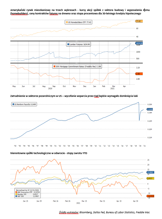 Po wielu latach ospałego wzrostu gospodarczego ciężko przystosować się do nowej, post-pandemicznej rzeczywistości i wysokich dynamik wzrostu PKB. Wchodzimy obecnie w okres, w którym wyniki spółek mogą przekraczać nawet najśmielsze oczekiwania analityków, zwłaszcza w bardziej cyklicznych sektorach gospodarki. Dobry przykład stanowi kończący się właśnie amerykański sezon wyników za pierwszy kwartał 2021. Skala przebicia konsensusu przez poszczególne spółki była imponująca – sektory finansowy i paliwowy przekroczyły oczekiwania zysków o 35%, a segment dóbr konsumenckich nawet o ponad 70%. Podobnej dynamiki, choć pewnie nieco słabszej i opóźnionej, możemy spodziewać się również w Europie. Nawet na krajowym rynku widać wiele przykładów spółek, które w trakcie pandemii skutecznie odchudziło stronę kosztową, a obecnie zaczyna korzystać na fali powracającego popytu (np. LPP, CCC). Wymiernie przekłada się to również na kursy ich akcji. Przegranymi w tej sytuacji są nierentowne spółki technologiczne, które w ostatnich latach cieszyły się dużym zainteresowaniem inwestorów detalicznych. Dobrym papierkiem lakmusowym dla tej grupy jest fundusz ARK Innovation ETF, który od początku roku stracił 13%, a obsunięcie od lutowego szczytu przekroczyło już 30%. Część spekulacyjnego kapitału została przesunięta w inne segmenty rynku, zwłaszcza w kierunku kryptowalut (obserwujemy, jak kapitalizacja Dogecoina zbliża się do łącznej wartości wszystkich spółek z WIG20).