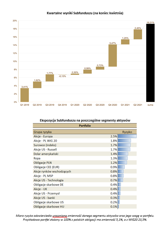 Portfel funduszu jest konsekwentnie przeważony w kierunku cyklicznych aktywów. Największym segmentem pozostają akcje spółek i indeksy o dużej wrażliwości na wzrost gospodarczy, ale posiadamy również dużą ekspozycję na surowce przy zredukowanym udziale segmentu dłużnego.