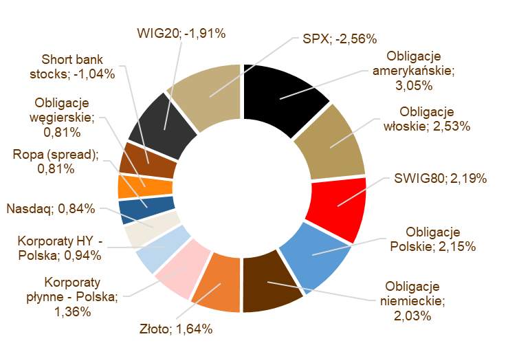 Udział długu korporacyjnego będzie w najbliższych okresach malał – niespełna połowa portfela korporacyjnego zapada w przeciągu najbliższego miesiąca, a do nowych zakupów podchodzimy z rezerwą. Utrzymujemy pozycję w obligacjach polskich i węgierskich, które korzystały w ostatnim czasie z programów luzowania ilościowego wprowadzonych przez NBP i NBH. Posiadamy również dług Włoch, który jest ciekawym (aczkolwiek nieco bardziej ryzykownym) elementem rozgrywki między Europejskim Bankiem Centralnym, organami UE i państwami członkowskimi. Pozycja w akcjach zagranicznych jest zabezpieczona kontraktami terminowymi, a łączny udział akcji netto jest minimalnie ujemny.